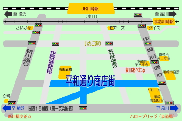 川崎『平和通り商店街』へのアクセスマップです。Googleマップもご参考までに添えて御座います。ご利用下さい。